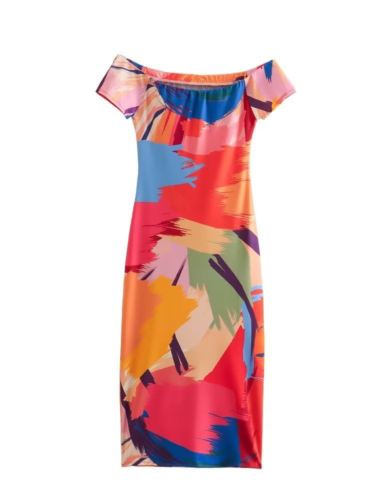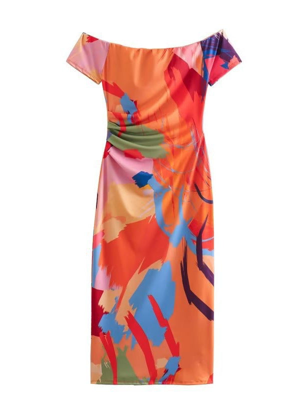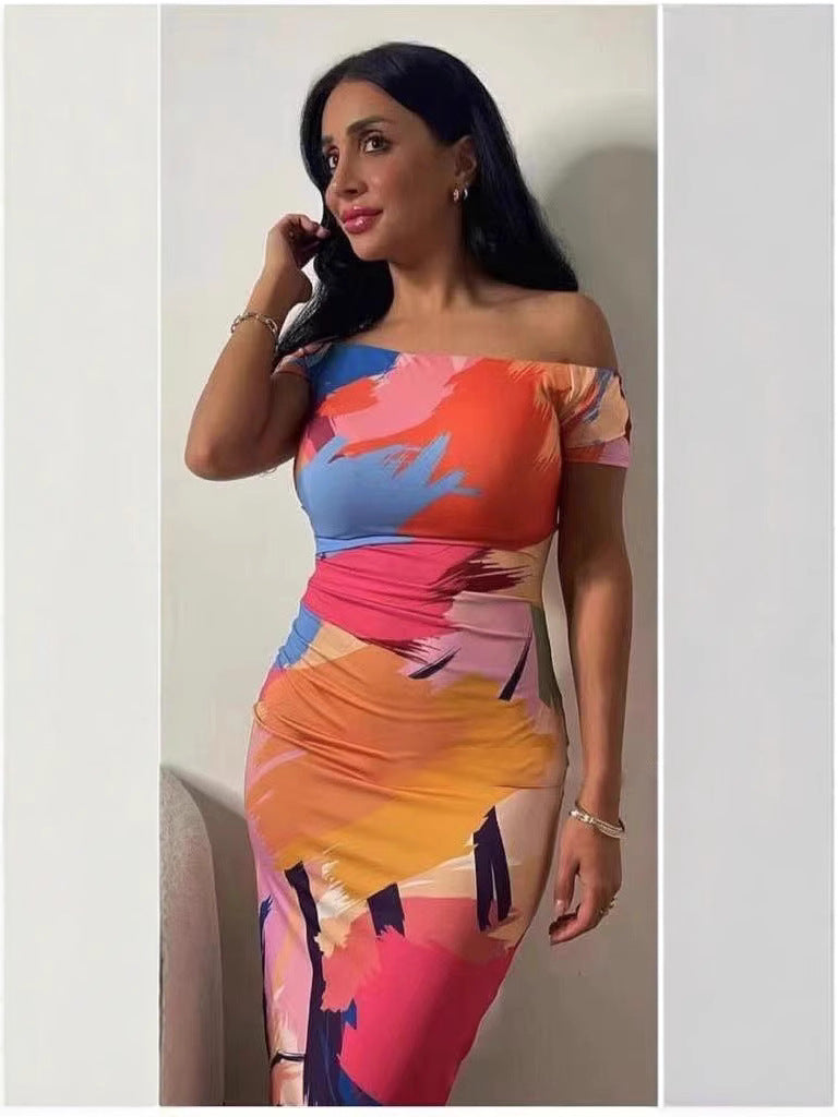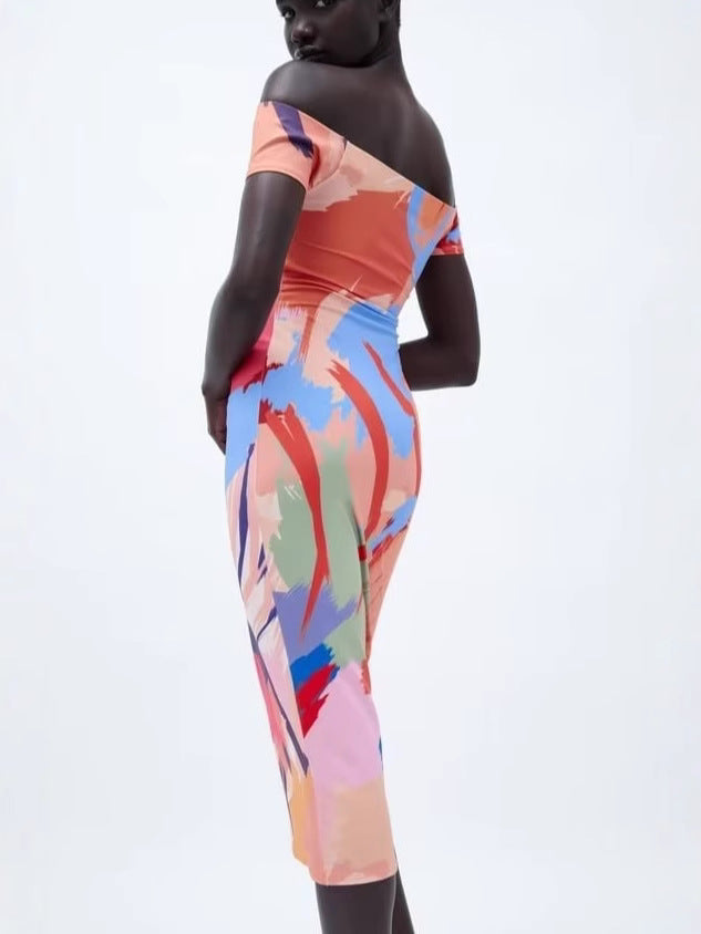 One-piece collar strapless Slim thin package hip printed minstrel short-sleeved dress women's clothing