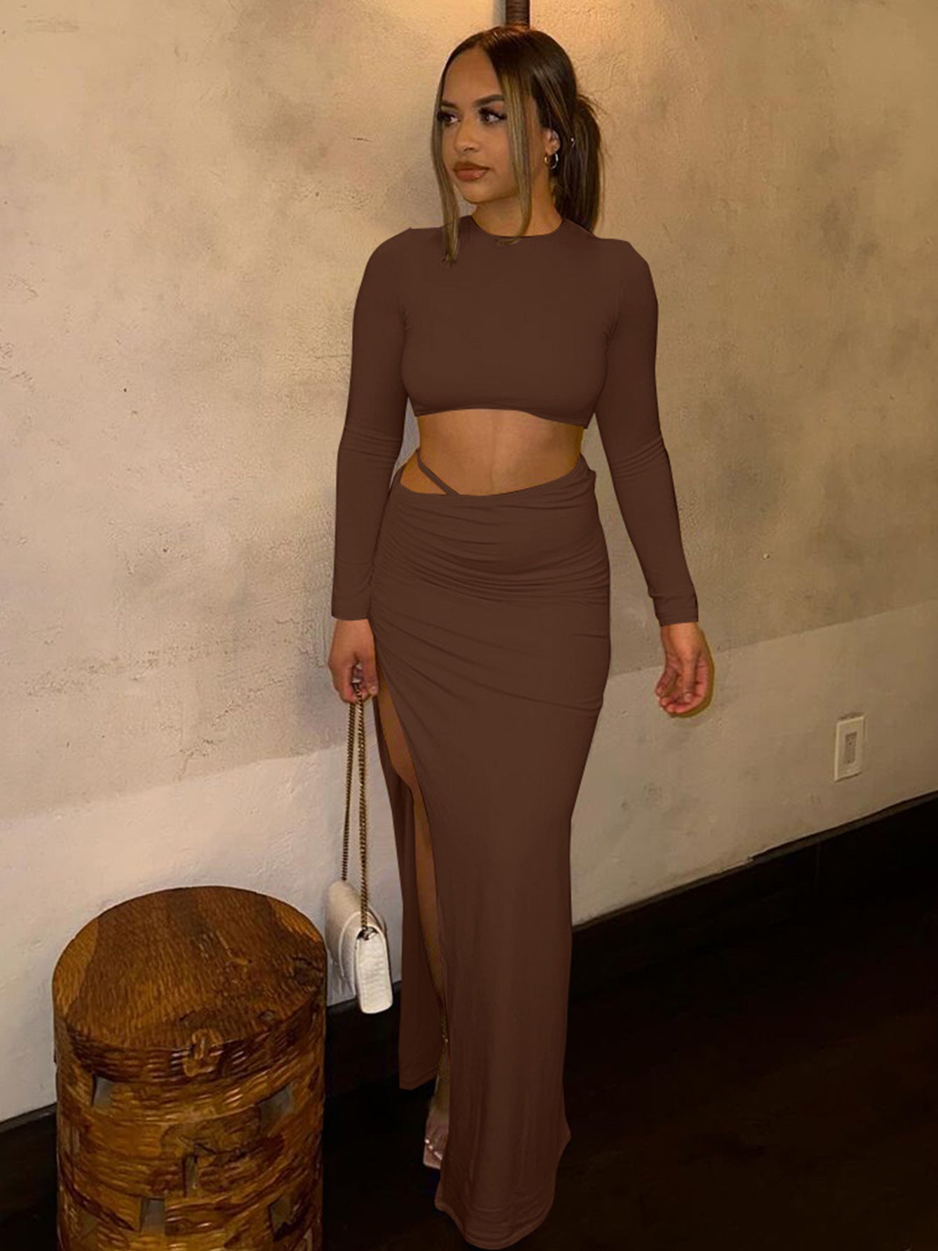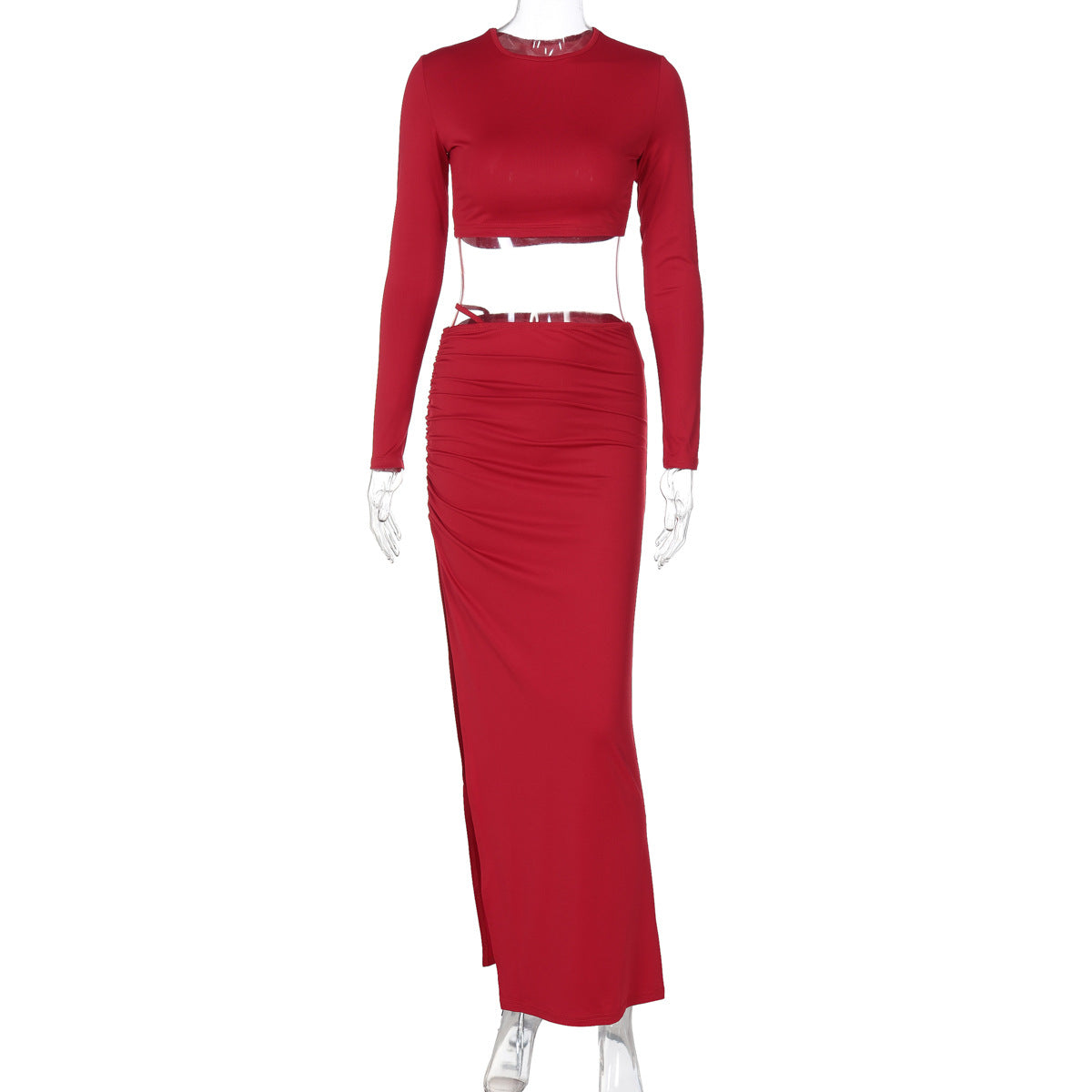Solid color long sleeve round neck pleated slit long skirt two piece set