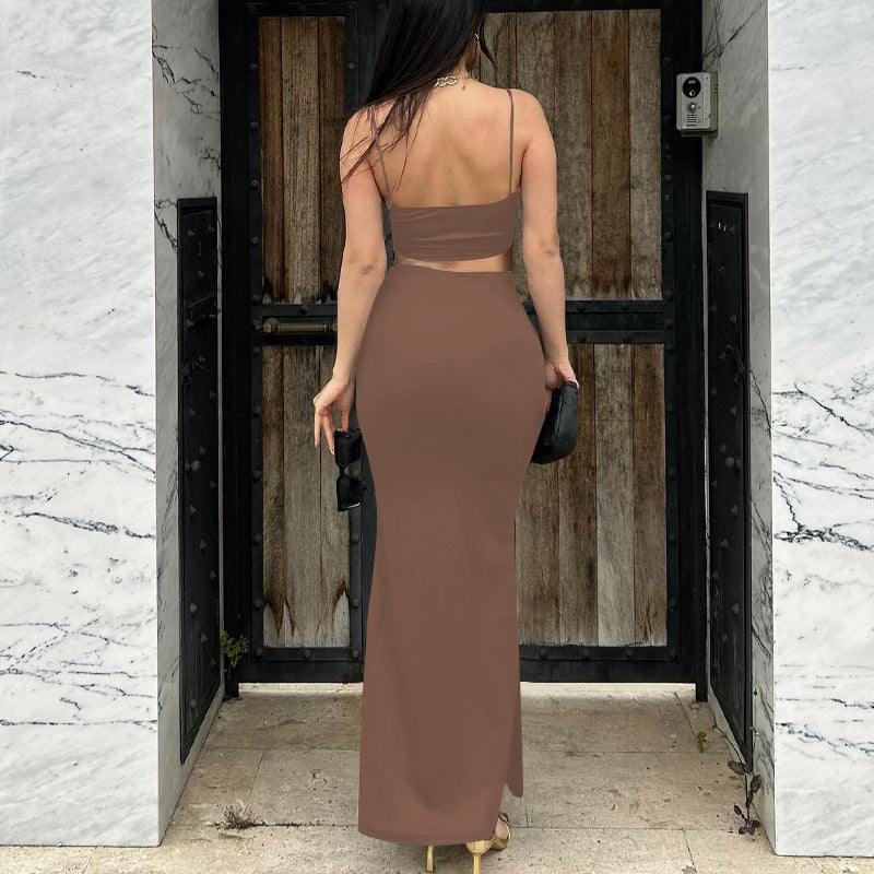 Solid color suspender wrap chest fashionable hip long skirt suit